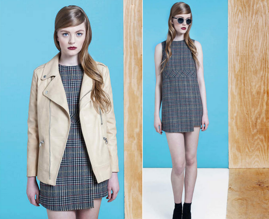 While the Spring 2014 collection veers toward the innocence and playfulness of summer, the Fall 2014 collection shows an edgier side, pairing school girl plaids with leather and dark lipstick. I love plaid, leather, and dark lipstick, but what I love even more is contrast. Also: retro. Think mod silhouettes and cat-eye sunglasses.